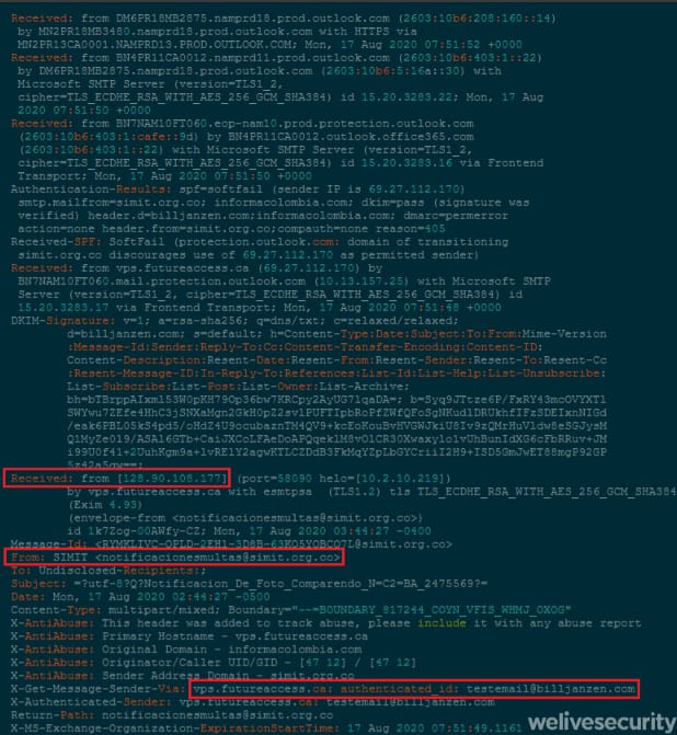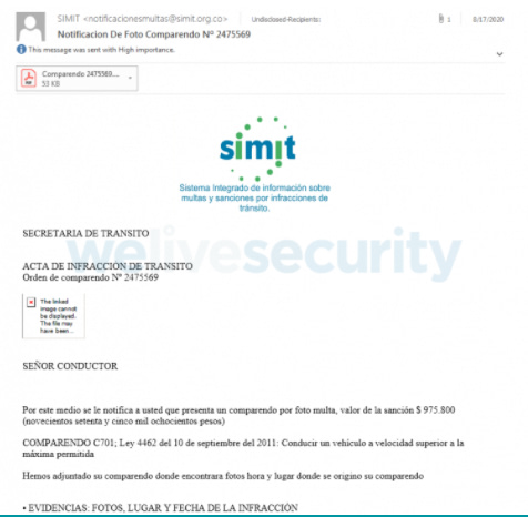 El correo electrónico que se muestra en la Figura 2 pretende ser una notificación acerca de una infracción de tránsito por un valor cercano a los USD 250. Se adjunta un archivo PDF que promete una foto de la infracción, así como información sobre la hora y el lugar del incidente. Se ha falsificado al remitente para que parezca que el correo electrónico proviene de SIMIT (un sistema para pagar las infracciones de tránsito en Colombia).