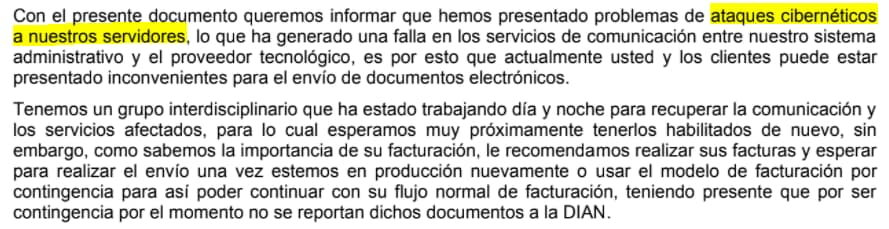 Una empresa desarrolladora de software también informo a sus clientes y proveedores que habían sufrido un ciberataque y estaban realizando todos los esfuerzos para restablecer los servicios que permitieran el envío de facturas electrónicas: