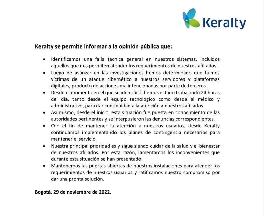 «Del mismo modo, desde el principio, esta situación se señaló a las autoridades competentes y se inició la investigación penal respectiva. Para mantener la atención de nuestros usuarios, desde Keralty Continuamos implementando los planes de contingencia necesarios para mantener el servicio.»