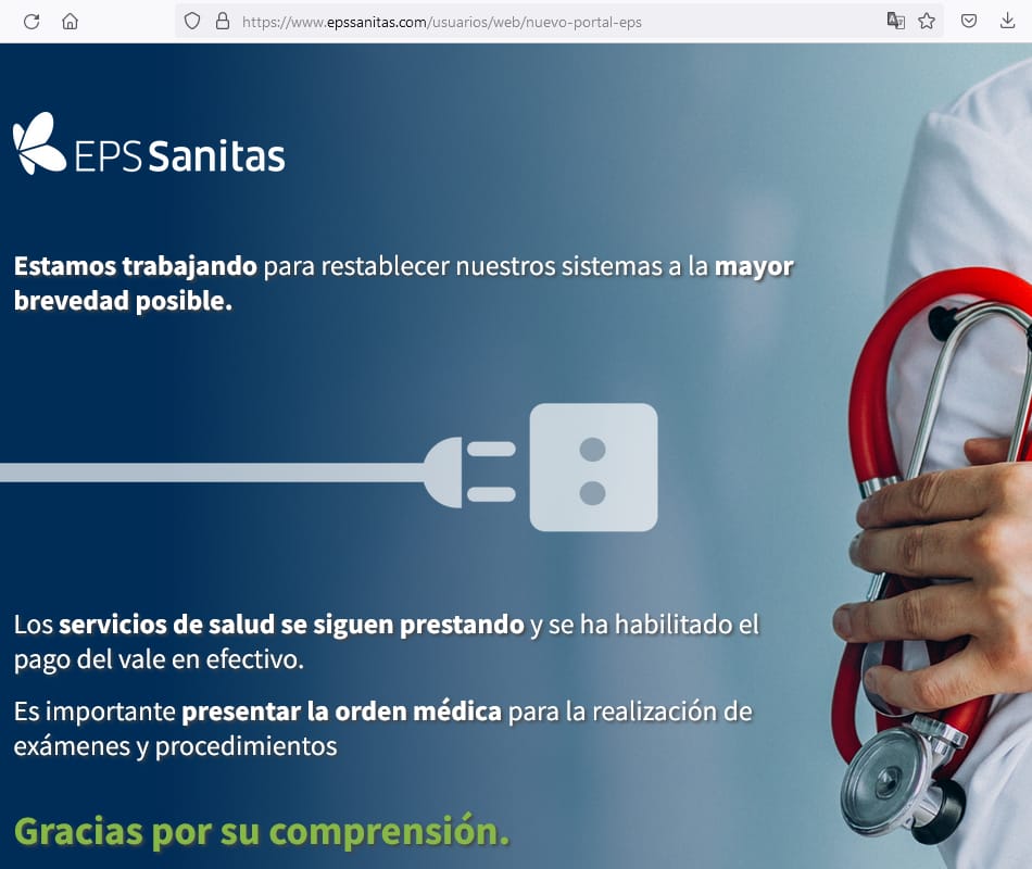Las interrupciones de TI han impactado el sistema de salud de muchos Colombianos, los medios locales informan que los pacientes han estado esperando en la fila durante más de doce horas para recibir atención y algunos pacientes se desmayan debido a la falta de atención médica.