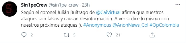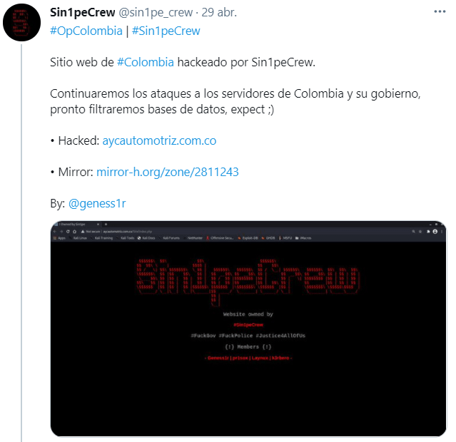 @sin1pe_crew, posible actor con geolocalización en Argentina ha participado en varias operaciones cibernéticas con afinidad a Anonymous. Desde 2020, su interés por sitios web colombianos del dominio gov.co se ha hecho evidente. Este actor evidenció su apoyo en redes sociales a la operación #OpColombia.