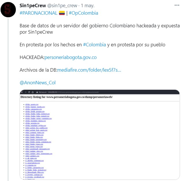 @sin1pe_crew, posible actor con geolocalización en Argentina ha participado en varias operaciones cibernéticas con afinidad a Anonymous. Desde 2020, su interés por sitios web colombianos del dominio gov.co se ha hecho evidente. Este actor evidenció su apoyo en redes sociales a la operación #OpColombia.
