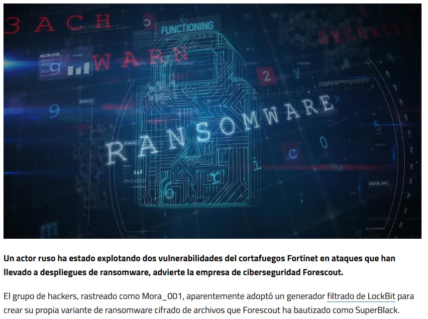- Mora_001 es un Grupo vinculado a LockBit activo en 2025, atacó dispositivos FortiOS y FortiProxy.