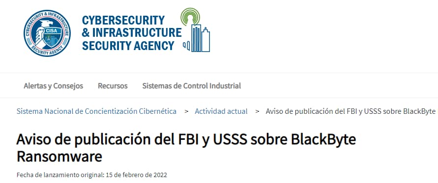 El 15 de febrero de 2022, la Oficina Federal de Investigaciones (FBI) y el Servicio Secreto de los Estados Unidos (USSS) han publicado un Aviso de Ciberseguridad (CSA) conjunto que identifica indicadores de compromiso asociados con el ransomware BlackByte.