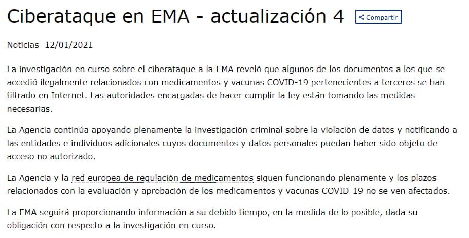 “Hoy, la Agencia Europea de Medicamentos (EMA) nos informó que la agencia ha sido objeto de un ciberataque y que algunos documentos relacionados con la presentación reglamentaria de Pfizer y la vacuna candidata COVID-19 de BioNTech, BNT162b2, que se ha almacenado en un servidor de la EMA, se había accedido ilegalmente