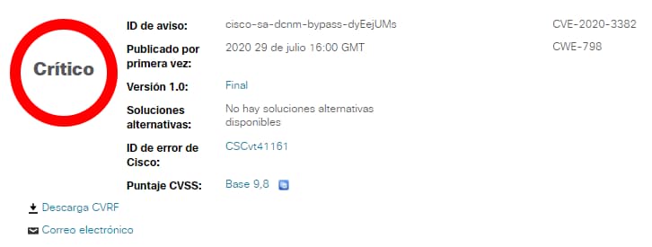 Vulnerabilidad de omisión de autenticación de Cisco Data Center Network Manager: Una vulnerabilidad en la API REST de Cisco Data Center Network Manager (DCNM) podría permitir que un atacante remoto no autenticado eluda la autenticación y ejecute acciones arbitrarias con privilegios administrativos en un dispositivo afectado. La vulnerabilidad existe porque diferentes instalaciones comparten una clave de cifrado estática. Un exploit exitoso podría permitir al atacante realizar acciones arbitrarias a través de la API REST con privilegios administrativos. No se sugiere utilizar una clave API estática o codificada. Esta es una práctica de seguridad deficiente, susceptible de interceptación y reutilización de claves.