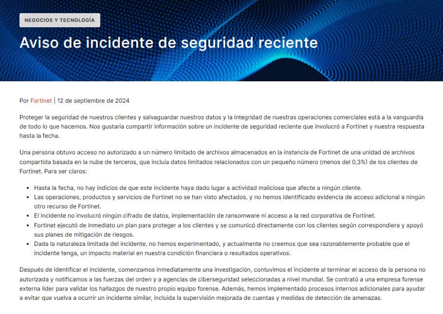 Fortinet una de las empresas de ciberseguridad más grandes del mundo ha confirmado que sufrió una violación de datos después de que un actor de amenazas afirmara haber robado 440 GB de archivos del servidor Microsoft Sharepoint de la compañía.
