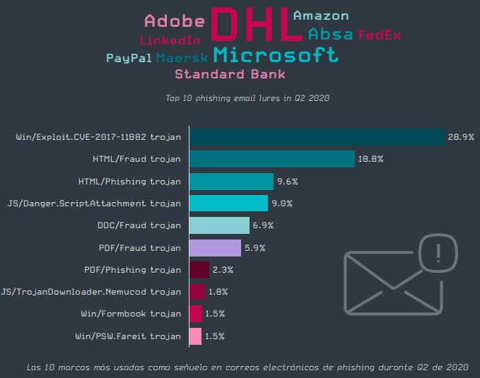 Los especialistas notaron una afluencia continua de ataques web y por correo electrónico que utilizan el COVID-19 como señuelo, donde los estafadores tratan de sacar el máximo provecho de la crisis. La telemetría de ESET también mostró un aumento en los correos electrónicos de phishing dirigidos a compradores online que se hacen pasar por uno de los principales servicios de paquetería del mundo, con un volumen diez veces mayor al del primer trimestre.