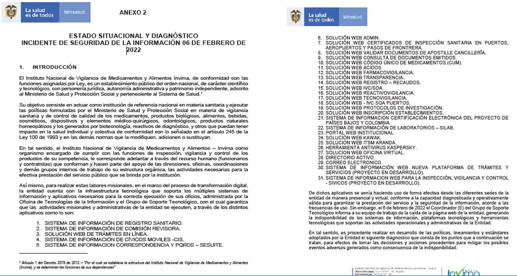 En dicho ataque, el INVIMA realizó un diagnóstico y análisis interno a sus sistemas generando un informe sobre el incidente presentado. En el informe se relaciona los sistemas de informacion, aplicaciones y software que esta usando la institución para su funcionamiento entre ellos el antivirus Kaspersky.