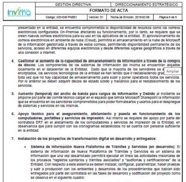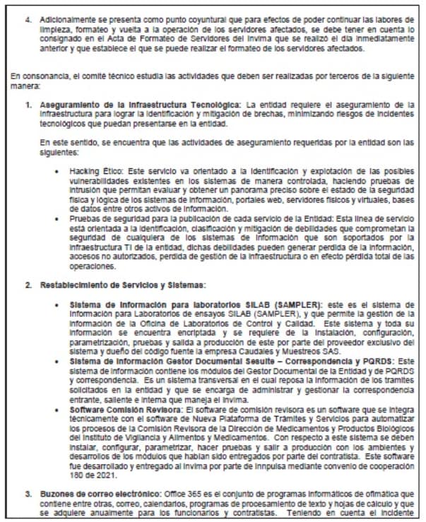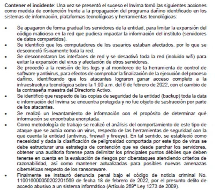 “Según los protocolos establecidos, la entidad ha deshabilitado el portal www.invima.gov.co, así como las conexiones con los servidores físicos y virtuales, hasta tanto se logre identificar el alcance del incidente presentado”, agregó.