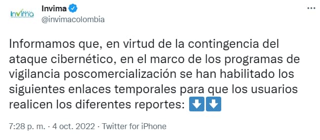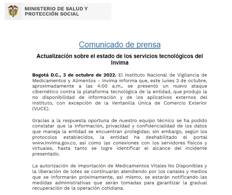 El 5 de octubre el INVIMA informó sobre la adopción de medidas administrativas transitorias para garantizar la continuidad en la prestación de los servicios y trámites, en el marco de la contingencia tecnológica que enfrenta desde el 3 de octubre de 2022. En tal sentido, a través de la Resolución No. 2022600000 del 4 de octubre de 2022, se suspenden los términos legales en los trámites, procesos y actuaciones especificados hasta el 31 de octubre de 2022.