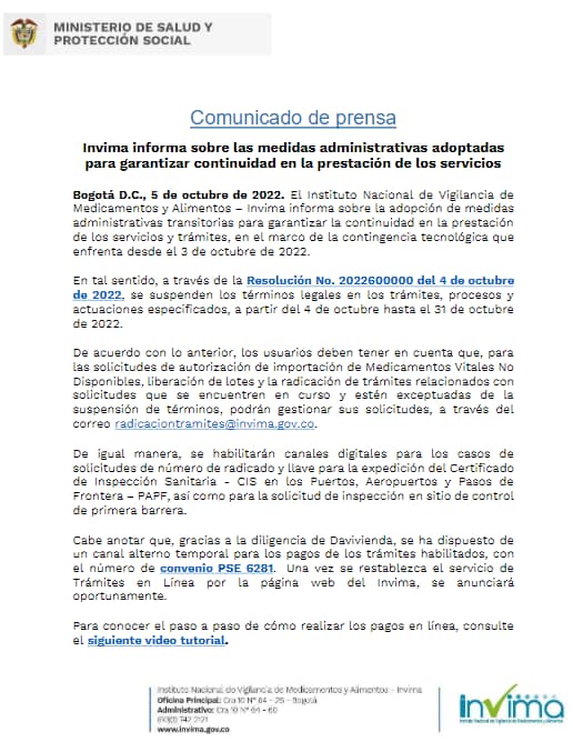 El 5 de octubre el INVIMA informó sobre la adopción de medidas administrativas transitorias para garantizar la continuidad en la prestación de los servicios y trámites, en el marco de la contingencia tecnológica que enfrenta desde el 3 de octubre de 2022. En tal sentido, a través de la Resolución No. 2022600000 del 4 de octubre de 2022, se suspenden los términos legales en los trámites, procesos y actuaciones especificados hasta el 31 de octubre de 2022.