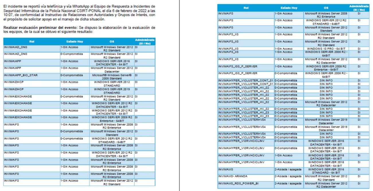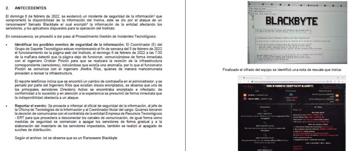 De acuerdo a los hallazgos recolectados por el INVIMA y analizados por el laboratorio de informática forense del Centro Cibernético de la Policía Nacional, se encontró muestras del Ransomware BlackByte.