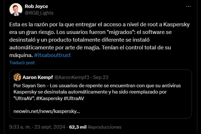 Después de que Kaspersky cerrara sus operaciones tras la prohibición de las ventas y actualizaciones del software antivirus Kaspersky por el gobierno de los Estados Unidos, a partir del 29 de septiembre de 2024, debido a los posibles riesgos para la seguridad nacional.
