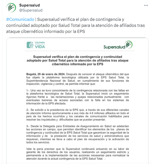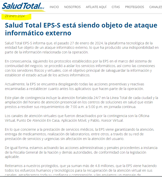 En mayo de 2022, la EPS Salud Total reportaba que había sido victima de un ciberataque que afectaba sus plataformas tecnológicas y debían suspender sus servicios virtuales. El pasado 27 de enero, vuelve a sufrir otro ciberataque que deja por fuera los servicios digitales a los usuarios de la EPS.