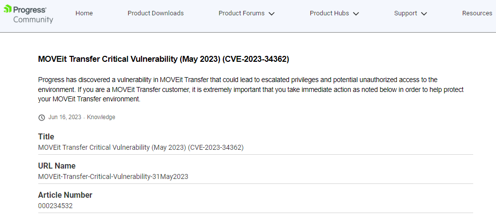 El 31 de mayo de 2023, Progress Software Corporation («Progress Software»), publicó un aviso sobre una vulnerabilidad «crítica» en MOVEit Transfer, un software de transferencia segura de archivos administrados (MFT) utilizado por una variedad de organizaciones. Tras la publicación de su aviso, han surgido informes de que la falla había sido explotada en la naturaleza como un día cero.
