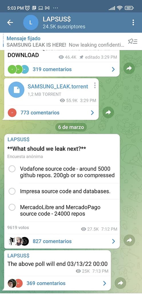 Si bien la información sigue siendo escasa, LAPSUS$ dice tener en su poder el código fuente de Mercado Libre (o un fragmento, al menos) y planea hacerlo público. Lo más llamativo es que esto se conoció por una encuesta que hicieron los propios hackers en su canal de Telegram; allí les consultaron a sus seguidores cuál debía ser la próxima filtración, siendo Mercado Libre y Mercado Pago una de las opciones.