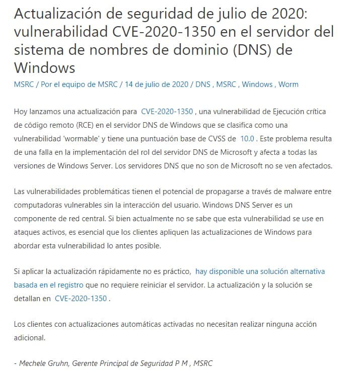 Microsoft ha anunciado que la vulnerabilidad CVE-2020-1350 ya ha sido parcheada, clasificándola con el nivel 10 de 10 de gravedad según el sistema vulnerabilidades (CVSS), utilizado por la industria como referente. A comparación, las vulnerabilidades aprovechadas por WannaCry fueron catalogadas con un 8,5.