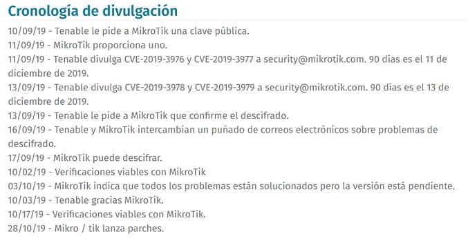 La tercera vulnerabilidad encontrada está relacionada con las actualizaciones del propio RouterOS, y es que un atacante podría generar un paquete de actualización malicioso, y si un usuario lo instalase en el propio router, podría habilitar un terminal con privilegios de superusuario. Este fallo de seguridad tiene el identificador CVE-2019-3976. Por último, también se ha descubierto una falta de validación de paquetes de actualizaciones cuando el parámetro de autoactualizar está activado, esto permitiría que un atacante remoto pudiera hacer un «downgrade» al firmware del router, e instalar una versión antigua para explotar fallos de seguridad que se han encontrado (y corregido) con anterioridad. Se ha asignado el identificador CVE-2019-3977 para esta vulnerabilidad.