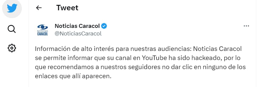 El presentador de noticias Andrés Montoya informo ante las cámaras lo siguiente: “Nuestro canal en YouTube ha sido hackeado, por esta razón recomendamos a nuestros seguidores no dar clic en ninguno de los enlaces que allí aparecen porque podrían poner en riesgo sus datos”,