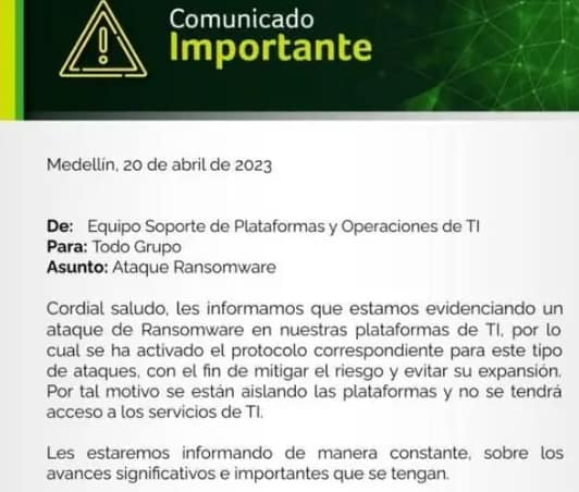 Luego que el grupo LockBit se atribuyera el ciberataque y le diera un ultimato a Nutresa hasta el 28 de abril para negociar, la compañía confirmo la afectación y compromiso de información privada y confidencial.