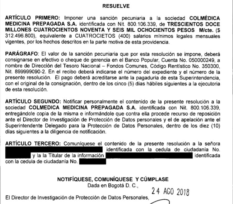 Uno de las clínicas sancionadas fue Colmédica medicina prepagada en 2018 por falta al principio de circulación restringida de la ley 1581, el cual establece el deber de conservar la información personal bajo condiciones de seguridad necesarias para impedir su adulteración, pérdida, consulta o acceso no autorizado o fraudulento. La infracción se presenta cuando se presenta divulgación masiva de información privada en una página web de la institución medica. La sanción fue por $312 millones de pesos.