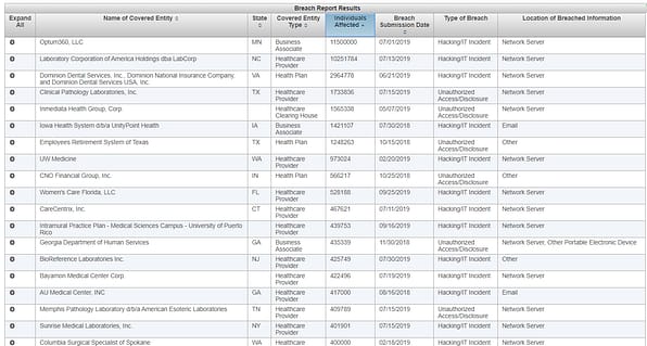 - AMCA es una compañía de cobranza médica que separa a varios grandes clientes nacionales de salud. En mayo, la compañía reveló que fueron atacados durante un período de ocho meses desde el 1 de agosto de 2018 y el 30 de marzo de 2019. HealthcareIT Security informó recientemente que 12 millones de datos de pacientes de Quest Diagnostic y 7.7 LabCorp se vieron afectados como parte de esta violación.