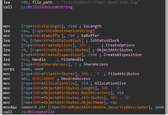 Según una publicación de blog publicada por investigadores de Sentinel Labs, para limpiar el registro «ri4d», se hizo XOR con sí mismo. Por este método, la constante «FILE_SUPERSEDE» siempre está presente en el parámetro «CreateDisposition». La transacción que crea el archivo después de eliminar el original es «FILE_SUPERSEDE». Se puede ver en la imagen que no confirma si es un archivo o un enlace.