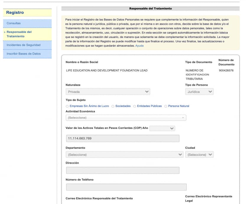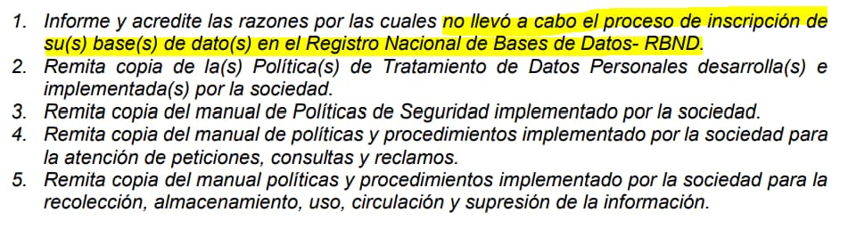 cumplimiento de su deber como Responsable del Tratamiento, impartiendo una orden administrativa con el fin de que la investigada lleve a cabo la inscripción de sus bases de datos en el Registro Nacional de Bases de Datos- RNBD y complete satisfactoriamente el registro. Adicionalmente, al no presentar la Política de Tratamiento de Datos Personales, no atender los requerimientos de la autoridad de protección de datos personales y no adoptar y presentar Manual interno de políticas y procedimientos para garantizar el