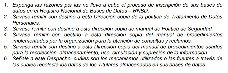cumplimiento de su deber como Responsable del Tratamiento, impartiendo una orden administrativa con el fin de que la investigada lleve a cabo la inscripción de sus bases de datos en el Registro Nacional de Bases de Datos- RNBD y complete satisfactoriamente el registro. Adicionalmente, al no presentar la Política de Tratamiento de Datos Personales, no atender los requerimientos de la autoridad de protección de datos personales y no adoptar y presentar Manual interno de políticas y procedimientos para garantizar el