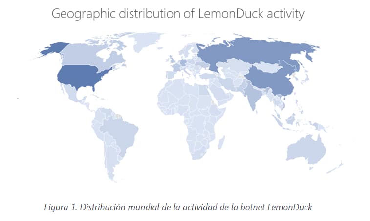 En los primeros años, LemonDuck apuntó en gran medida a China, pero desde entonces sus operaciones se han expandido para incluir a muchos otros países, centrándose en los sectores de fabricación e IoT. Hoy en día, LemonDuck impacta en un rango geográfico muy amplio, y los Estados Unidos, Rusia, China, Alemania, el Reino Unido, India, Corea, Canadá, Francia y Vietnam son los que experimentan la mayor cantidad de encuentros.