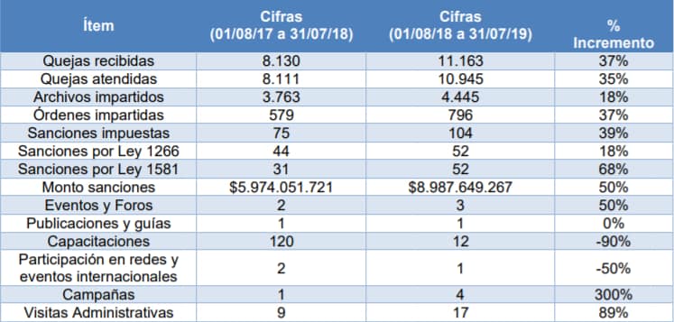 Sobre el manejo de datos personales, informó que entre agosto de 2018 y julio de 2019 se han impuesto 104 multas por un monto aproximado de $9.000 millones. Se destaco que: