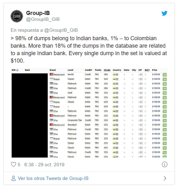 La filtración contiene datos de más 1,3 millones de usuarios, y han sido puestos a la venta en la ‘tienda de tarjetas’ Joker’s Stash. Según Group-IB, la información de dichas tarjetas fue subida a esa plataforma clandestina el 28 de octubre. La compañía rusa de ciberseguridad con sede en Singapur ha determinado que más del 98 % de las tarjetas pertenecen a bancos indios, mientras que el 1 % a entidades financieras de Colombia.