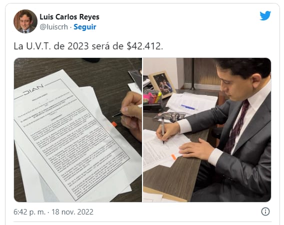 La Unidad de Valor Tributario (UVT), que estará vigente para el 2023 será de $42.412, informó este viernes el director de la Dian, Luis Carlos Reyes, a través de sus redes sociales.