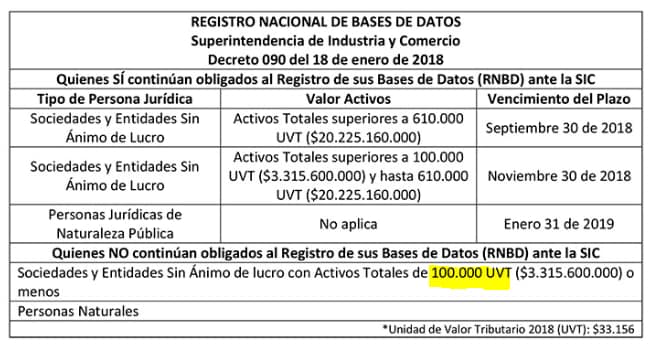 Quienes continúan con el deber de registrar sus bases de datos son las sociedades y entidades sin ánimo de lucro que tengan activos totales superiores a 100 mil Unidades de Valor Tributario (UVT), es decir, $4 mil 241 millones. También deben hacerlo todas las entidades públicas.