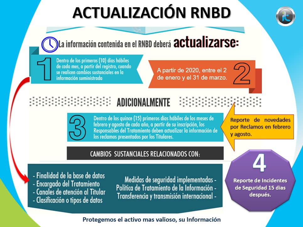 Como vemos, con estos reportes y actualización al registro RNBD, las empresas estarán dando cumplimiento a uno de los puntos que exige la ley, que es la comunicación con la superintendencia de industria y comercio SIC y el no hacerlo oportunamente, es quedar en la lista de las empresas que serán objeto de revisión y verificación.