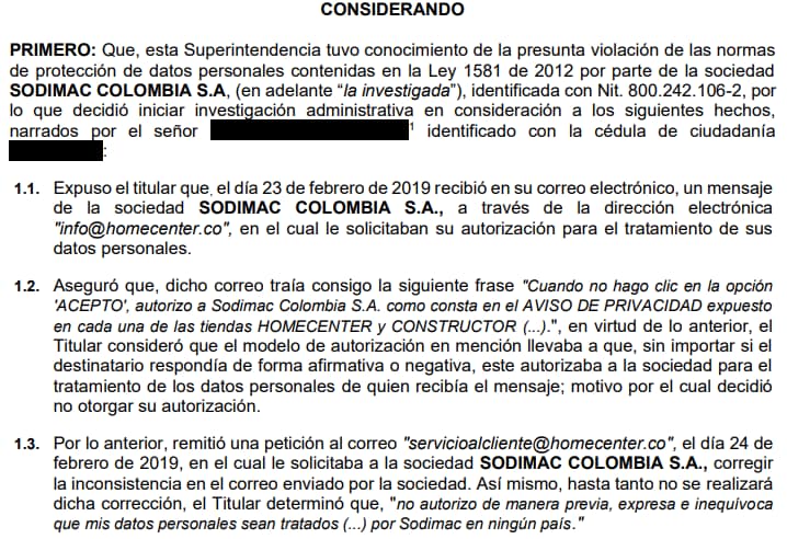 Mediante la Resolución 59001 del 24 de septiembre de 2020 que surgió con ocasión de una denuncia ciudadana mediante la cual desde la dirección de correo [email protected] le remitieron un mensaje solicitando su autorización con la siguiente frase: “Cuando no hago clic en la opción ‘ACEPTO’, autorizo a Sodimac Colombia S.A. como consta en el AVISO DE PRIVACIDAD expuesto en cada una de las tiendas HOMECENTER y CONSTRUCTOR (…).«.