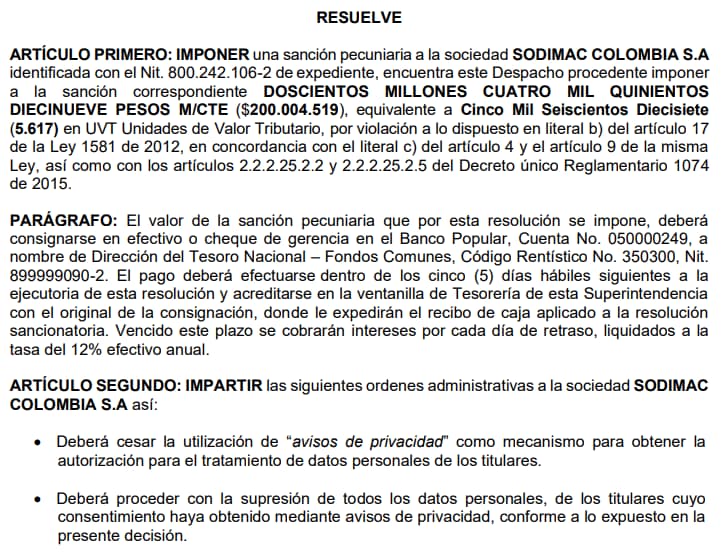 Fuente: https://www.sic.gov.co/slider/superindustria-sanciona-sodimac-colombia-y-le-ordena-eliminar-informaci%C3%B3n-por-infringir-ley-de-datos-personales