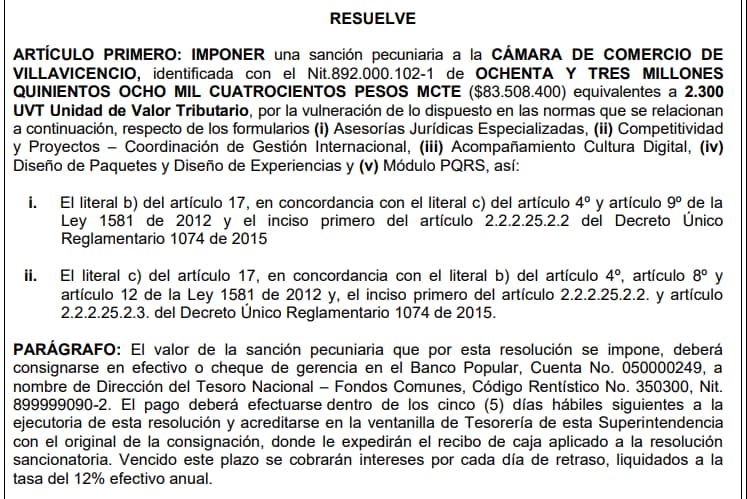 Cámara de Comercio de Villavicencio: Resolución 39514 y una sanción de: $83.508.400. Esta Cámara reconoció expresamente la comisión de la infracción, razón por la cual la multa inicial se redujo.