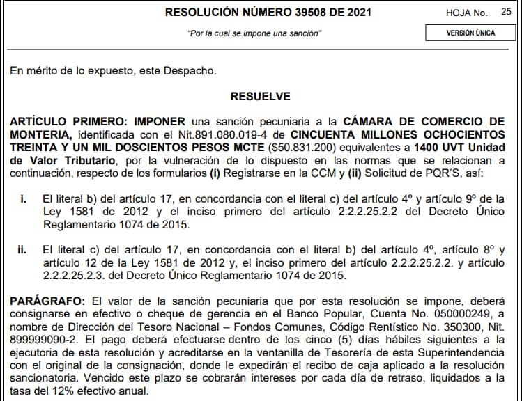 Cámara de Comercio de Montería: se estableció una sanción de: $50.831.200, mediante resolución 39508.