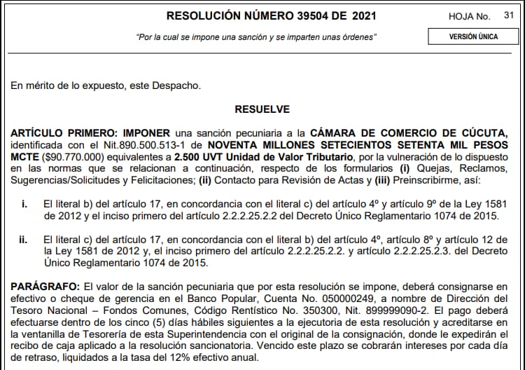 Cámara de Comercio de Cúcuta: Resolución 39504 y una sanción de: $90.770.000.