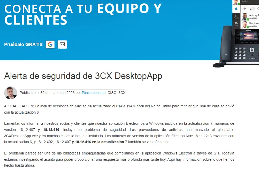 El CISO Pierre Jourdan de 3CX informo a los clientes de que varias versiones de su aplicación Electron Windows contenían un «problema de seguridad». Las versiones afectadas incluyen Electron Windows App 18.12.407 y 18.12.416 de Update 7, así como las versiones de la aplicación Electron Mac 18.11.1213, 18.12.402, 18.12.407 y 18.12.416.