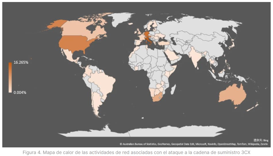 Los datos de telemetría compartidos por Fortinet muestran que la distribución geográfica de las máquinas víctimas que llaman a la infraestructura controlada por actores conocidos abarca principalmente: Italia, Alemania, Austria, Estados Unidos, Sudáfrica, Australia, Suiza, Países Bajos, Canadá, Reino Unido y Latinoamérica.