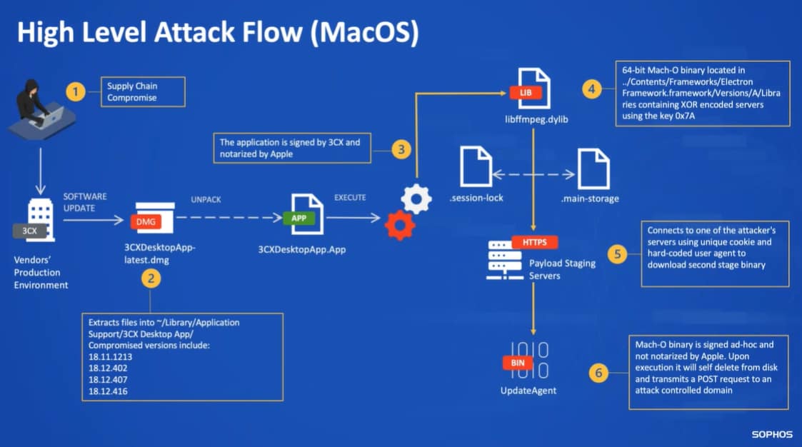 El proveedor de software de telecomunicaciones empresariales 3CX confirmó el ataque a varias versiones de su aplicación de escritorio para Windows y macOS conocido como ataque a la cadena de suministro.